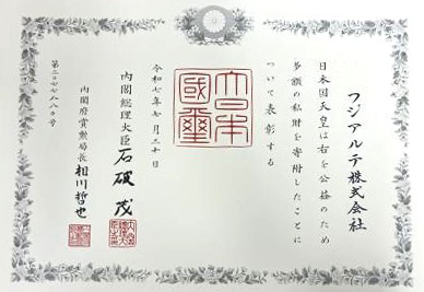 令和6年能登半島地震の復興支援として行った寄付の功績が認められ、今年度は紺綬褒章を拝受しました。
