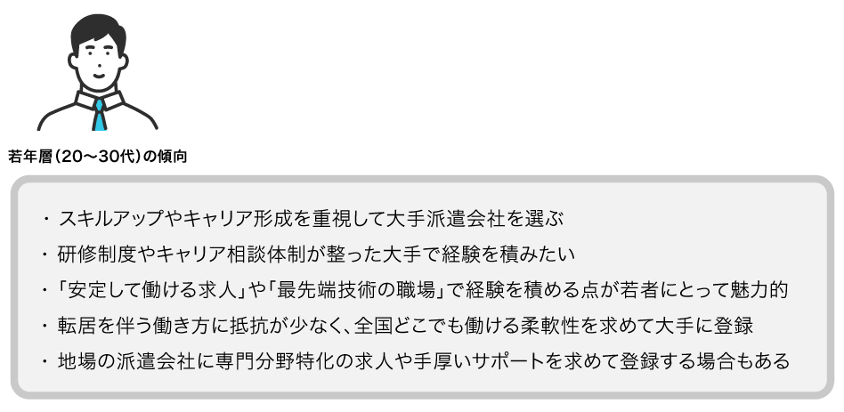 若年層の派遣求職者は、スキルアップやキャリア形成を重視して大手派遣会社を選ぶ傾向があります。研修制度やキャリア相談体制が整った大手で働くことで経験を積みたいと考える人が多いようです。また、全国規模の派遣会社は一部上場企業や大手メーカーなど大企業の求人案件も多いため、最先端の職場で経験を積みたい若者にとって魅力的です。実際、製造派遣でも大手派遣会社は大手メーカーの工場案件など取引先が幅広く、「安定して働ける求人や最先端技術の職場が見つかる」期待ができます。