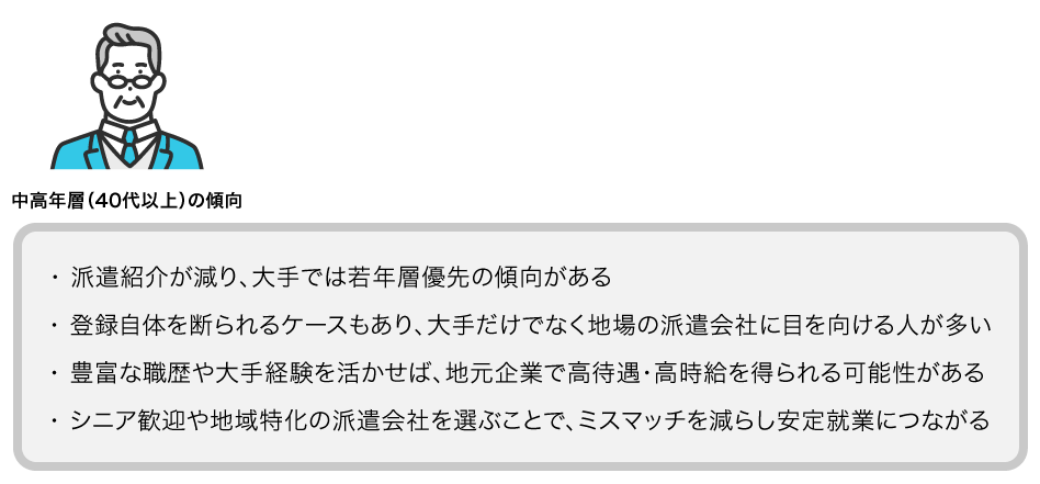 中高年層の派遣求職者は、大手と地場で選択が分かれる傾向があります。一般的に40代以降は派遣紹介が厳しくなると言われ、実際に「派遣法上は年齢制限NGでも、40代になると紹介される仕事が極端に減る」現実があります。