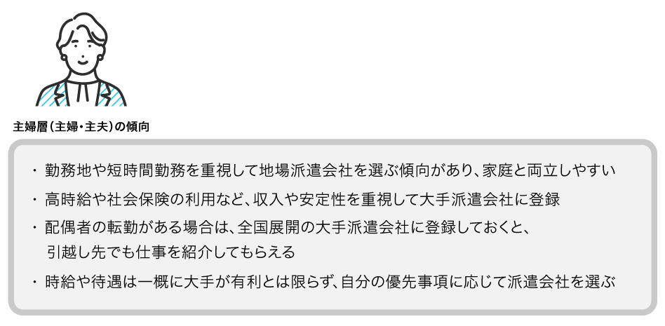 なお、主婦層に関して興味深い声として、同じ派遣先企業の仕事でも地場の派遣会社経由の方が時給が高かったという事例があります。実際「地方の派遣会社と大手派遣会社で同じ派遣先だったが、地元の会社経由の方が時給で200円も高かった」という口コミがあり、条件面では必ずしも大手=有利とは限らないようです。このように主婦層では、自分の優先事項(勤務地重視か収入重視か等)によって大手と地場のどちらを選ぶか傾向が分かれます。家庭の状況や将来の転居可能性も踏まえつつ、両方の派遣会社の求人やサポート体制を比較して選ぶ主婦の方が多いようです。