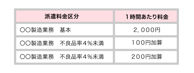 奨励手当は、不良品率が4%または2%未満を達成した翌月の派遣就労時間すべてに適用されます。