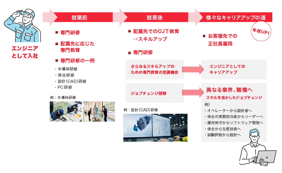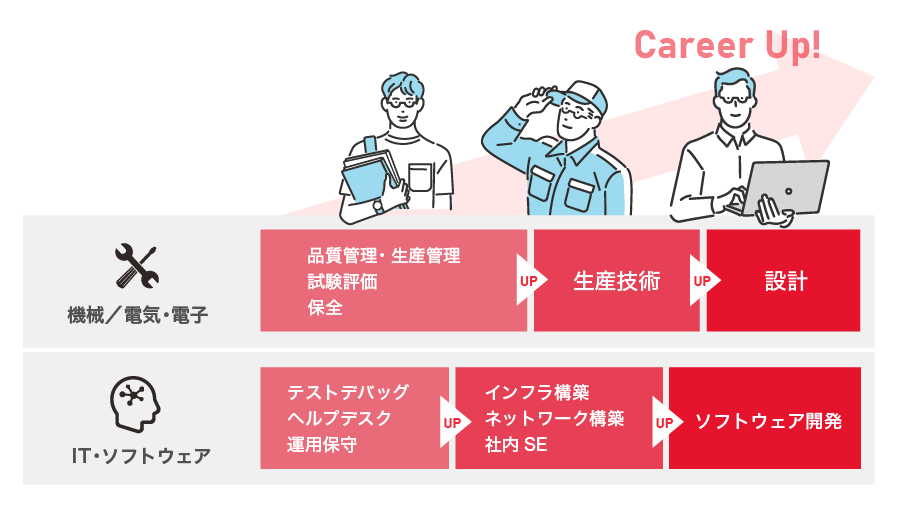 エンジニア未経験や文系出身の方でも、業務経験を活かしてスキルアップ・キャリアアップができます。